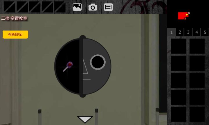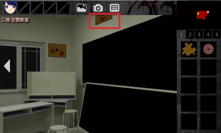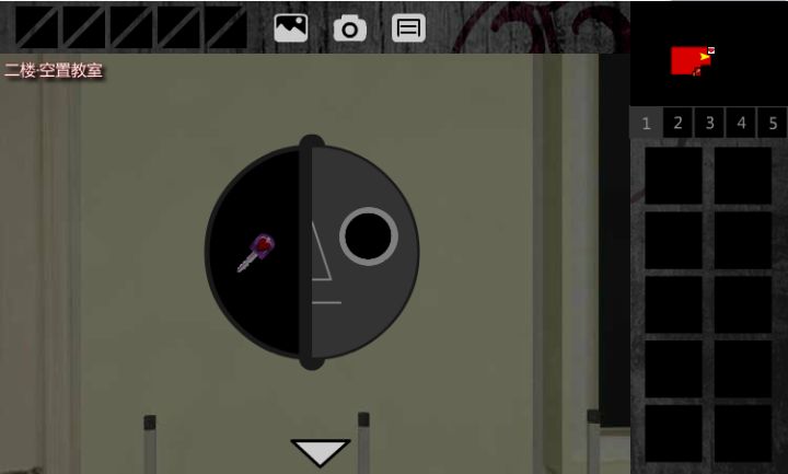 1.右转,在地上得到“部件”2.右转,在凳子上得到“部件”3.组合得到“大眼球”4.将“大眼球”放置于脸谱中,得到“红桃钥匙”5.用“红桃钥匙”解开门锁,出门6.触发剧情,后退,下楼7.右转,用“红桃钥匙”解开“一楼·医务室”的门8.右转,出门,触发剧情9.用“红桃钥匙”解开“一楼·高一2班课室”的门10.右转,得到“书本”11.出门,左转,上楼,左转,进入右侧的“二楼·图书馆
