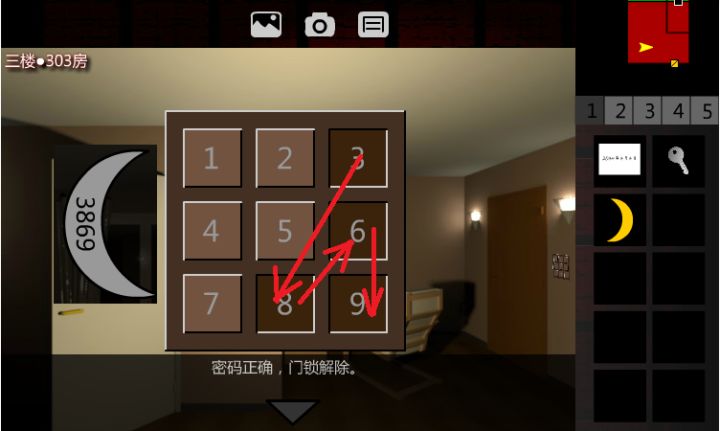 接逃脱结局,爆炸结局前部分。32.剧情结束后,后退,点击旁边密码器,是三阶数字幻方。使横纵斜之和均为15即可完成谜题。进入6F•西走廊。33.右转2次,看到一幅奇怪的画,拍照(记录)。进电梯,点击2F,出电梯,进入2F•西走廊。34.左转,点击画板。仍然是L/R/D/U。在4F•西走廊我们有提示:2R,1D,2L,1U组成了一个闭合图形。2R是向右2格走。2R到达1U/1D后,要向上/向下