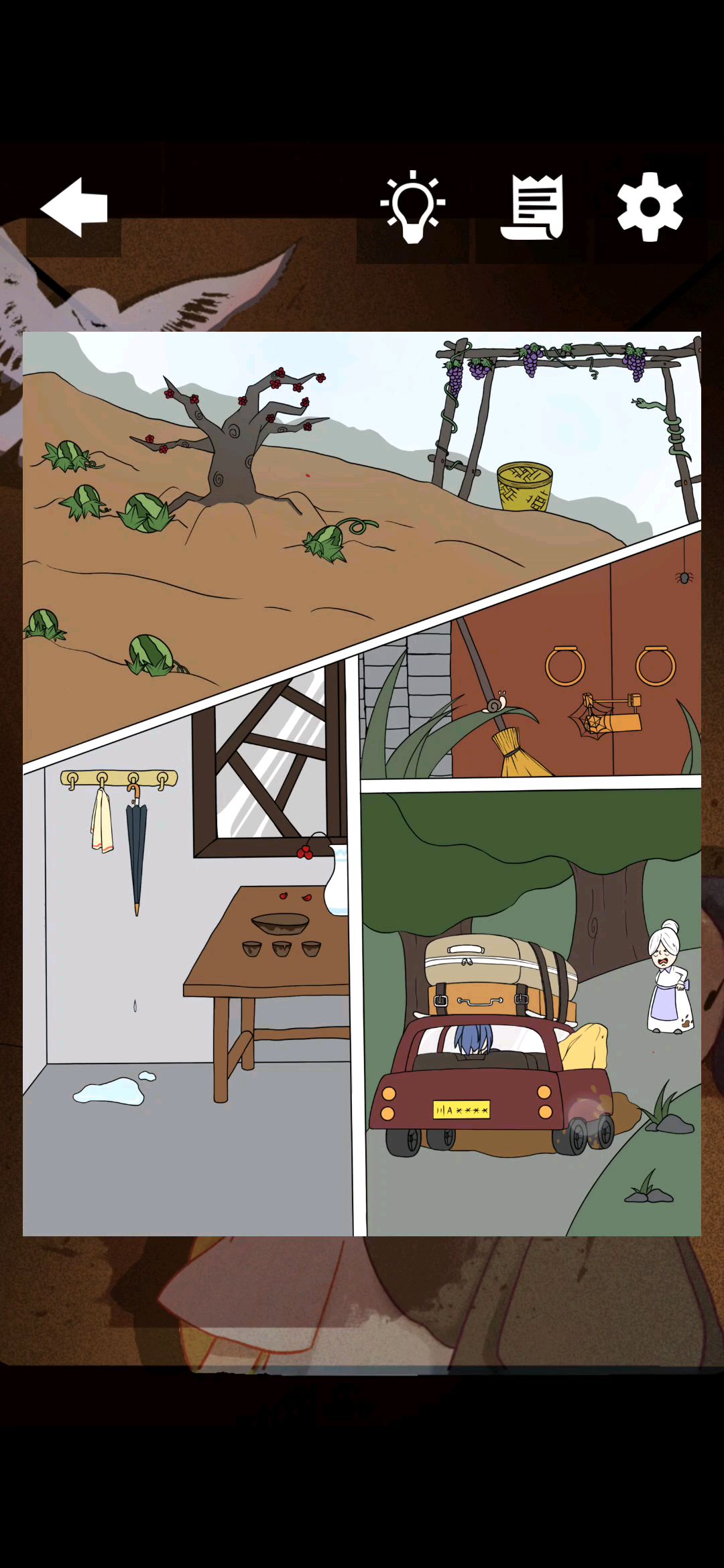 ✅Stage.1 怪异的村子1.点击枯树上的梅花(梅花冬季开花,季节不对)。2.点击门锁上的蜘蛛网(长时间没人住,都结蜘蛛网了)。3.点击雨伞下的一滩水(没人住的房子,雨伞居然还在滴水)。4.点击张阿姨裙子下摆的泥点(没碰到怎么会在那么远的距离粘上泥点)。✅Stage.2 处处诡异1.点击柜子旁的枝苗(都长枝苗了怎么会有人居住)。2.点击趴在地上夜川的头(当然是趴在地上看到的)。3