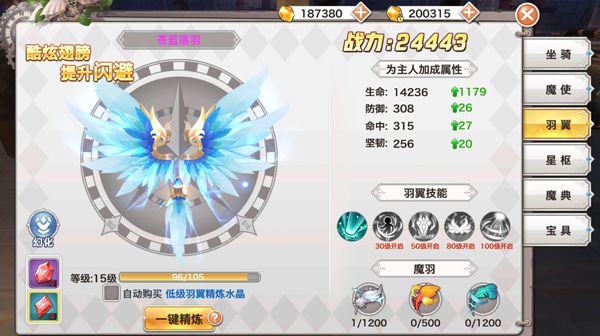 羽翼系统坚持以炫酷华丽的外观,搭配强大独特的特性。羽翼系统在玩家达到40级的时候即可解锁。1、羽翼属性羽翼可以为角色属性提供生命、防御、命中、坚韧四个基础属性方面的加成。 2、羽翼技能 同时羽翼也将给玩家带来5个不同的羽翼技能: 3、羽翼道具 我们还为羽翼提供进阶进化与属性资质加成的道具。魔羽:总共分为耀光羽灵、炽焰羽灵、疾风羽灵,不同的魔羽加成的属性也截然不同,每个魔羽最多可以使用