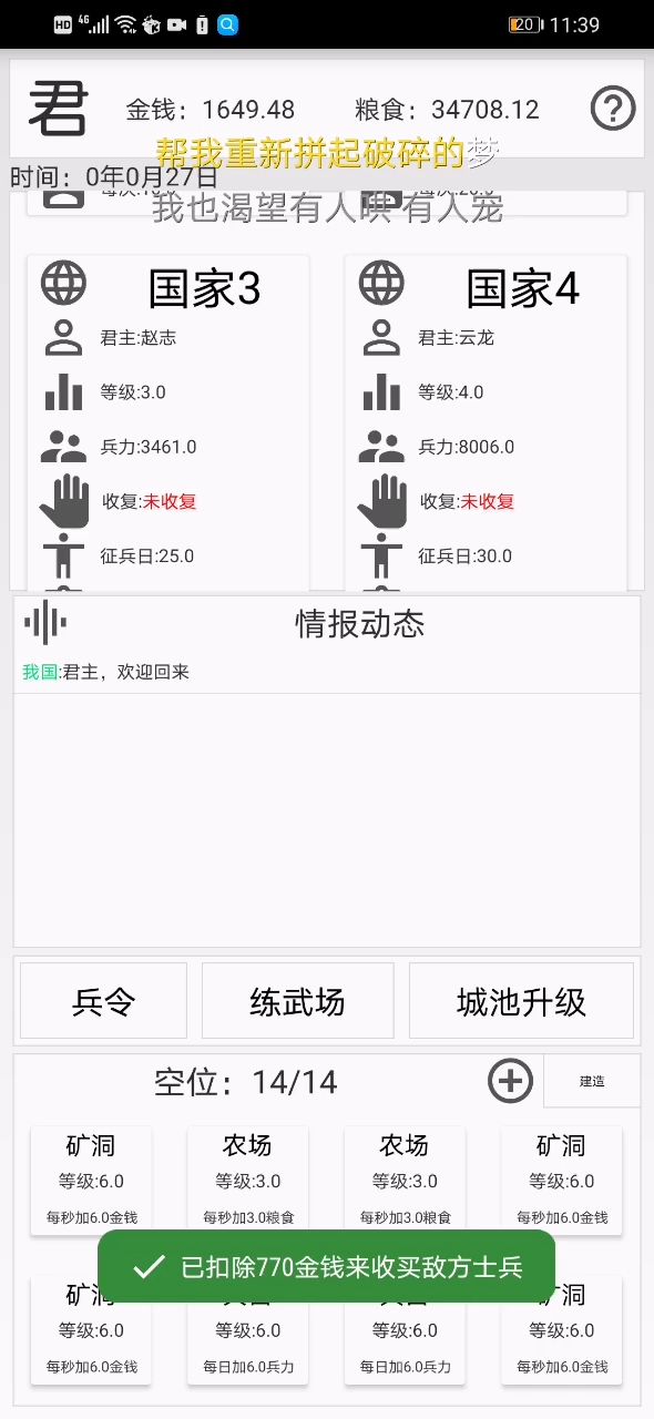 玩了一会,刚开始不知道怎么玩,浪费了十来天,不知道该干什么,最后花了两个月通关……这游戏只要五个五级粮仓,其它全部去挖矿,这游戏钞能力强就无敌,士兵从其他地方买就完事了,买到无兵可买,再花点钱(甚至不需要钱)劝降他们就结束了。