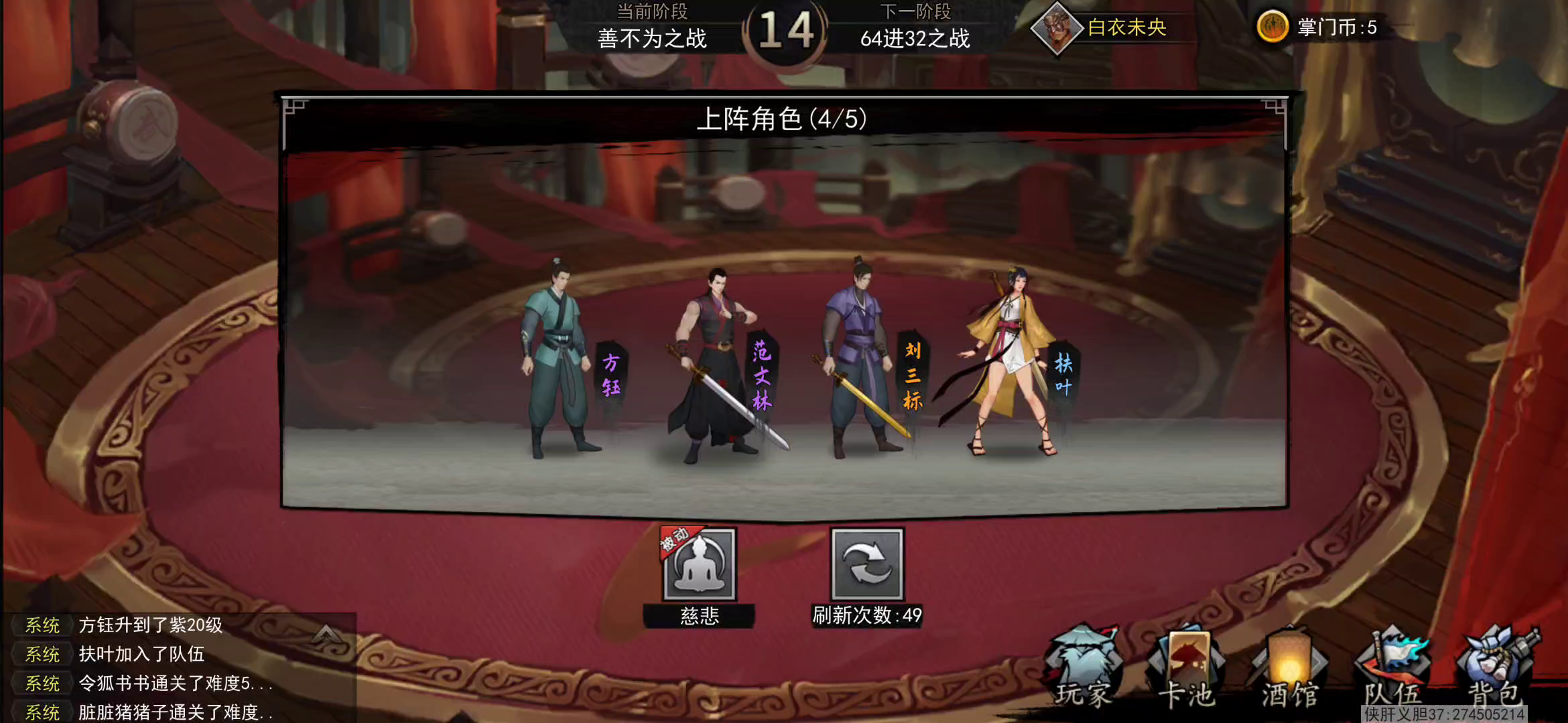 今天中午玩的,遇见两真人,结果4个暗金卡都被他们拿走了🌚🌚到最后全部换了羁绊丹,亏大发了,另外,掌门对决的武学天赋不显示了。