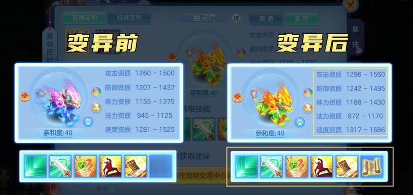萌新七天速成第三课:宠物养成小课堂 好了,少侠们!今天讲讲游戏的宠物养成相关内容,让你也能拥有一直属于自己的宝宝。今天,我就来讲讲基础的宠物养成内容。 本篇关键词:宠物的选择、打书流程、资源分配。 一、宠物优先级选择:技能>成长>资质 1.技能格数量决定上限 初始技能格子数量是宠物价值的核心指标。变异宠物最高可达6技能(普通宠物5技能),建议新手优先选择满技能变异宠物。例如65级可捕捉的凤凰,