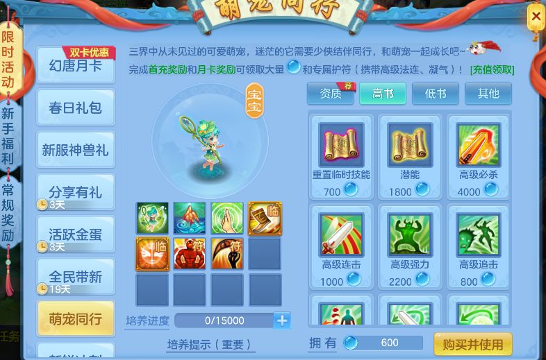 新手平民玩家前期能用的宠物非常少,首充党也仅仅是多了一个重炮小熊。我们能用的也只有小欣和熊小炮。不卡低等级段也没必要去养鱼将军什么的。所以免费赠送的小荷灵就显得非常重要,可以一直用到出幽灵虎。 下面就是我个人培养的一些心得和建议: 小荷灵同其他的专属宠物一样,都有萌宠同行养成活动,不购买月卡和额度的话有15000培养值。这里按照系统推荐的来,优先升级资质,吃满两颗萌宠进修丹,增加40点全属性资质