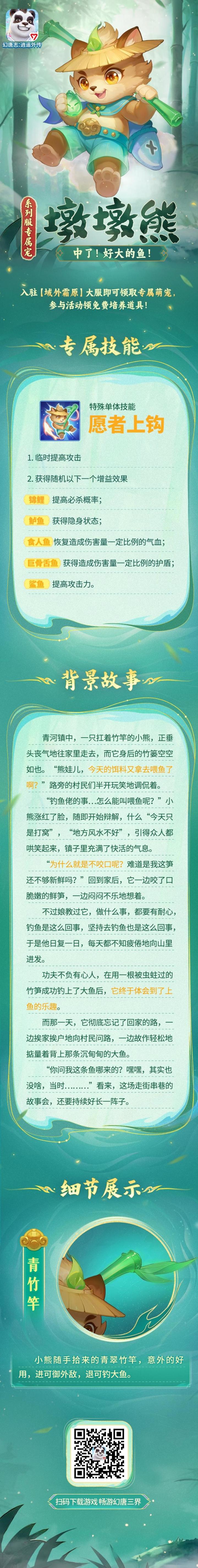 春季大服将迎来全新大服专属宠“墩墩熊”!活动期间,少侠们可以通过参与活动获取积分,免费培养“墩墩熊”!全新特殊技能愿者上钩单体攻击并且上钩一条随机鱼类,获得对应的增益状态。