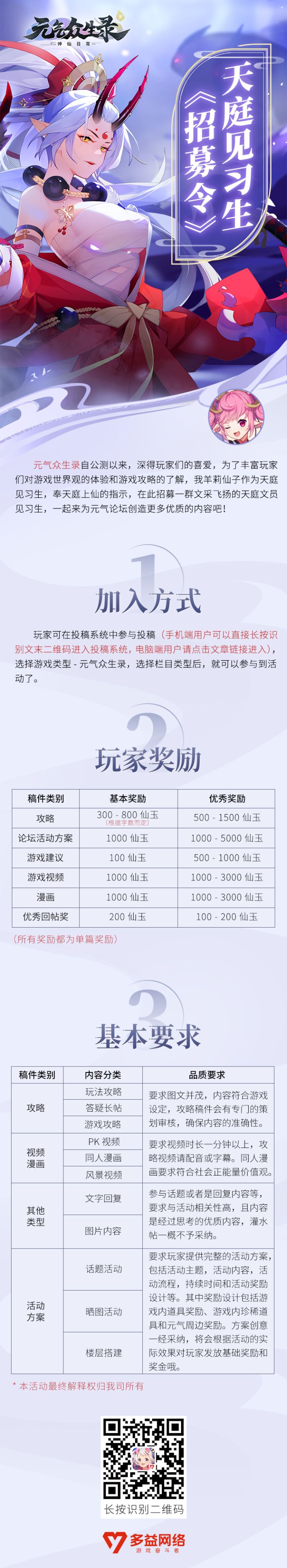 元气众生录自公测以来,深得玩家们的喜爱,为了丰富玩家们对游戏世界观的体验和游戏攻略的了解,我羊莉仙子作为天庭见习生,奉天庭上仙的指示,在此招募一群文采飞扬的天庭文员见习生,一起来为元气论坛创造更多优质的内容吧!