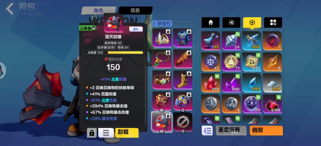 原标题:零氪金,召唤一,20E伤害,后续运气超好,又提升到50E了 正常来说20亿以内是一个比较容易达到的程度,剩下需要的东西就很贵了, 加强召唤!!! 加强召唤!!! 加强召唤!!! 20230629 今天终于出了接近完美的锤子,花了7500火,结果瓦到了随机数值,吐了,恶心人是真有一手 20230615 为爱发电,换了条6层的腰带,换了无限壁垒,换了头,换了戒指比之前多了点暴击,换了手套比之前