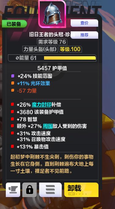 早上终于三星20层了,感觉输出上去之后刷的是真舒服,两次就过了。这个赛季算是完成了,准备去专家服受虐,接下来分享一下自己的BD,这个肯定很多主播都有说过,反正都是大差不差的,这边我就给出文字版去讲解一下。 首先装备: 头:基底选择魔力封印的力量头,解梦魔力封印或者光环效果,这个看你自己的魔力封印。 前缀:魔力封印,生命,智慧或者敏捷。 后缀额外加周围敌人受到伤害,攻速,最后一条你要是抗性够就补暴击