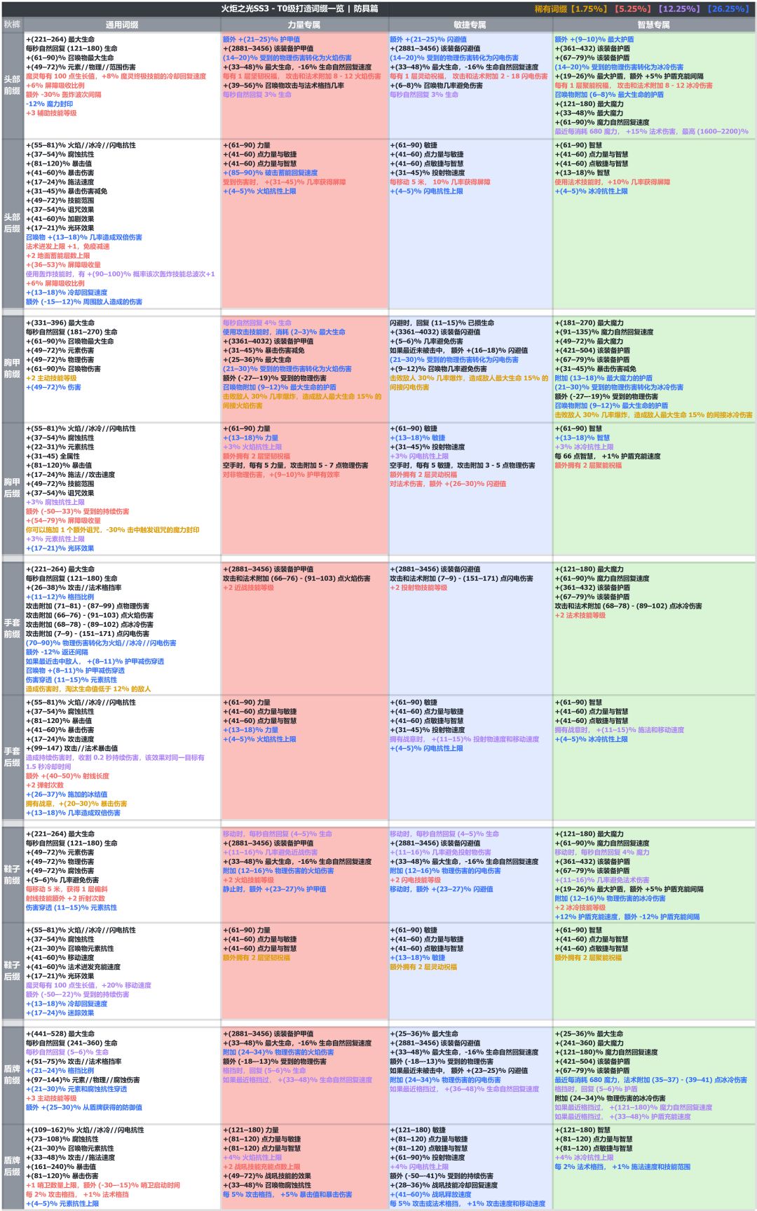 还在忧愁哪些词条值钱吗?最稀有的就是最值钱的,请把图三看两遍!特别是黄色词条,仅仅1.75%的概率出现,清理背包不发愁 01.20更新日志:新添精简版和极简版 图一为原版,包含所有数据 图二精简版,仅含<50%概率的词缀 图三极简版,仅含<15%概率的词缀(ps:也是我最喜欢的一版,加上T1光环魔力封印什么的就可以做过滤器了哈哈哈,如果有精力的话) ------------------------