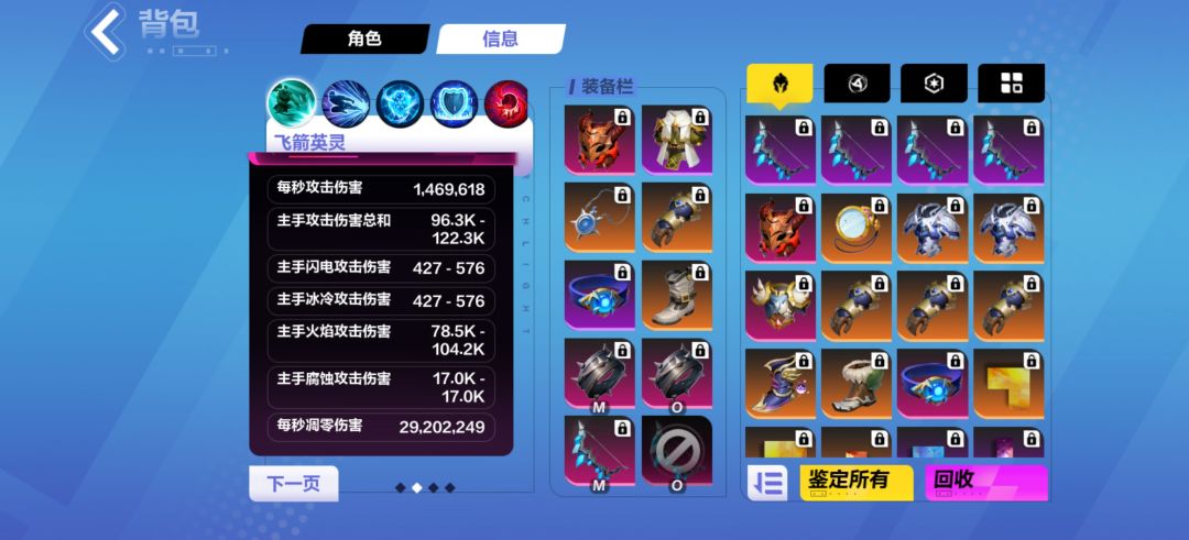 带邪心可以超1200层凋零,理论能翻3倍到30兆,但是由于移除凋零机制伤害不稳,导致1秒内多次被移除,最终1秒总结算凋零在4兆到12兆。所以放弃了。 此bd已经能打25-27万亿秒伤。面板凋零秒伤2900万,基础凋零1800左右。 bd思路: 1、通过高攻速及配合3个英灵发出攻击9支箭击中7成大致就是6-7支。稳定击中180次/秒,大致16-18万亿伤害。 2、在高攻速的加成下,凋零就可通过附加腐