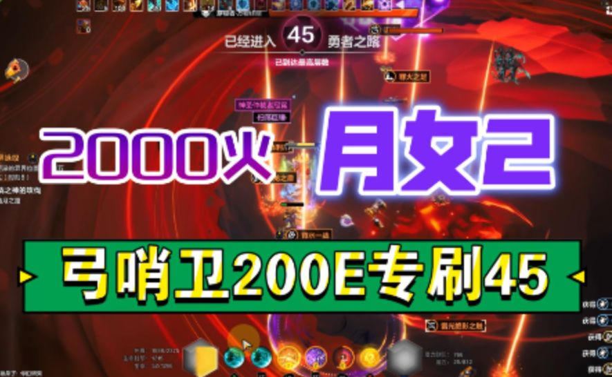 字幕来不及校对,辅看。 满掉落宠45层√ 伤害防御足够√ 全程3防护技能不断 √ 鞋子不能用,锐利加持,会取消BUFF。 哨卫技能有一些奇妙BUG,最典型的是戒指灵动祝福每层+暴击率的不生效,所以增伤困难。 不过弓哨卫因为是攻击技能+橙武器+橙鞋子,天生就比其他哨卫更容易堆伤害,下限上限也就高了很多,比较好用。 简单遗物+聚权减伤,冷眼减CD,低血护盾堆叠光环,好用,正常可2000E输出。 综合大