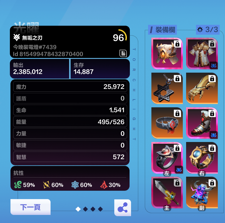 之前发帖不知道要写清楚季前赛什么的,网友提醒后还有人教了怎么分享流派码 目前1525层流派码 hDzsz9r4Ee68+wAAAAAAmA== 目前这身是随手打的,没有追求太多,打桩100亿足够刷图和小迷城,生存2.8亿1500+不会死,但是如果不足1亿的话可能会被秒,格挡宠物很强,我抽了一下格挡宠物很省装备空间,打王的时候换头盔,脱腰带,我计算着尽量保证首领等级4以内就能到1525不崩,否则14