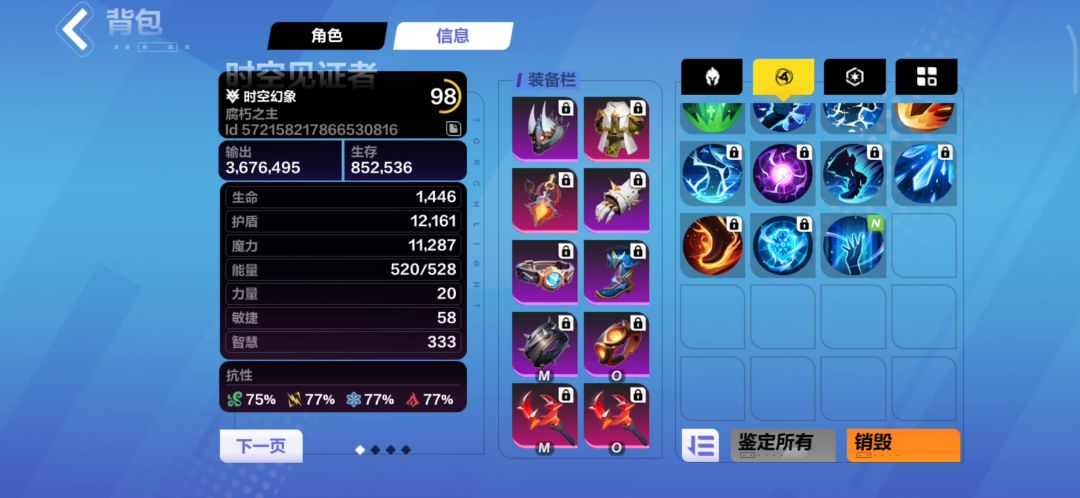 我将从我自己的装备开始讲解,我是玩时空1的,别的角色的装备没有过多研究!我也只会讲解我自己认知范围内的知识。首先说明,大部分情况下,紫装是会比橙装好的。并不是属性的差距,而是词条的适合程度的多少。 首先是对于三种属性有个了解 力量是唯一一个加伤害的属性,可惜我的时空1是法师,需要法术攻击与元素攻击加成。吃不到这个加成。 敏捷+速度和闪避。打的更快! 智力+护盾和蓝量。并不会加成伤害。 好了,如图,