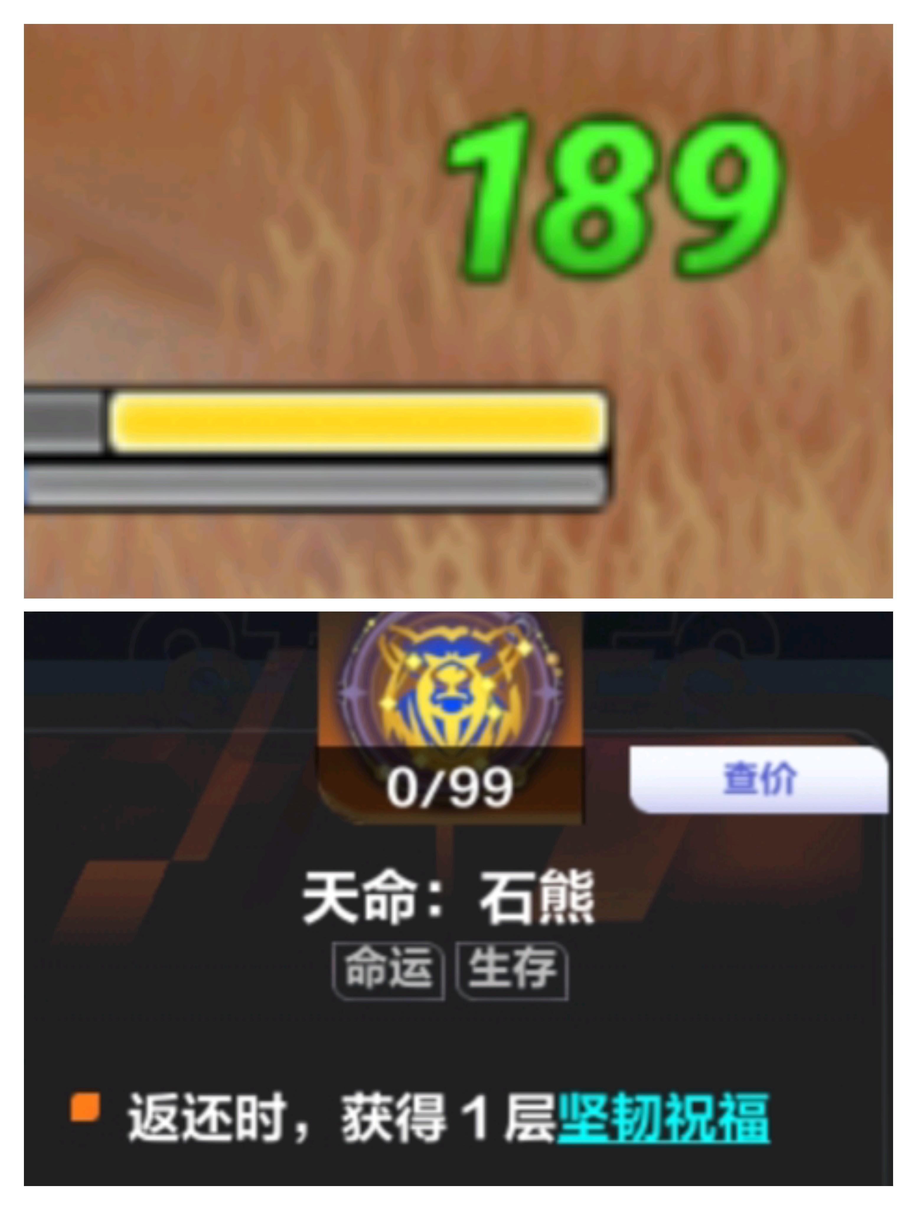 图一的189是一直返回的生命,但是不会触发天命石熊的效果:返还时,增加坚韧祝福天才阿宽看下