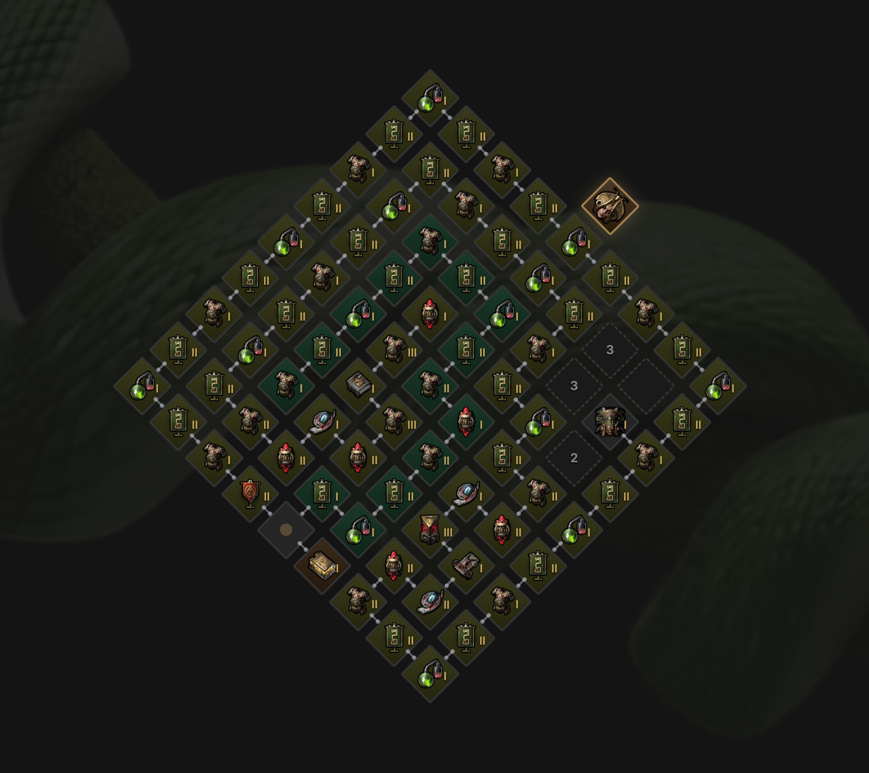 最近流放2的神庙玩法不知道大家知道不知道。国服两个礼拜,物价就比上个赛季4个月的物价还低。简单说一下这个玩法:1.通过异界刷图,积攒能量,6点能量可以开启一次神庙。2.每次开启神庙,会给你6个随机房间。3.每次打完神庙可以选择手动关闭或者自动关闭,关闭神庙会按比例损失一部分房间。4.不同的房间会给你的神庙添加不同的属性,一个神庙有多个房间组成(每个房间就是一张小图)。神庙有81个格子,但