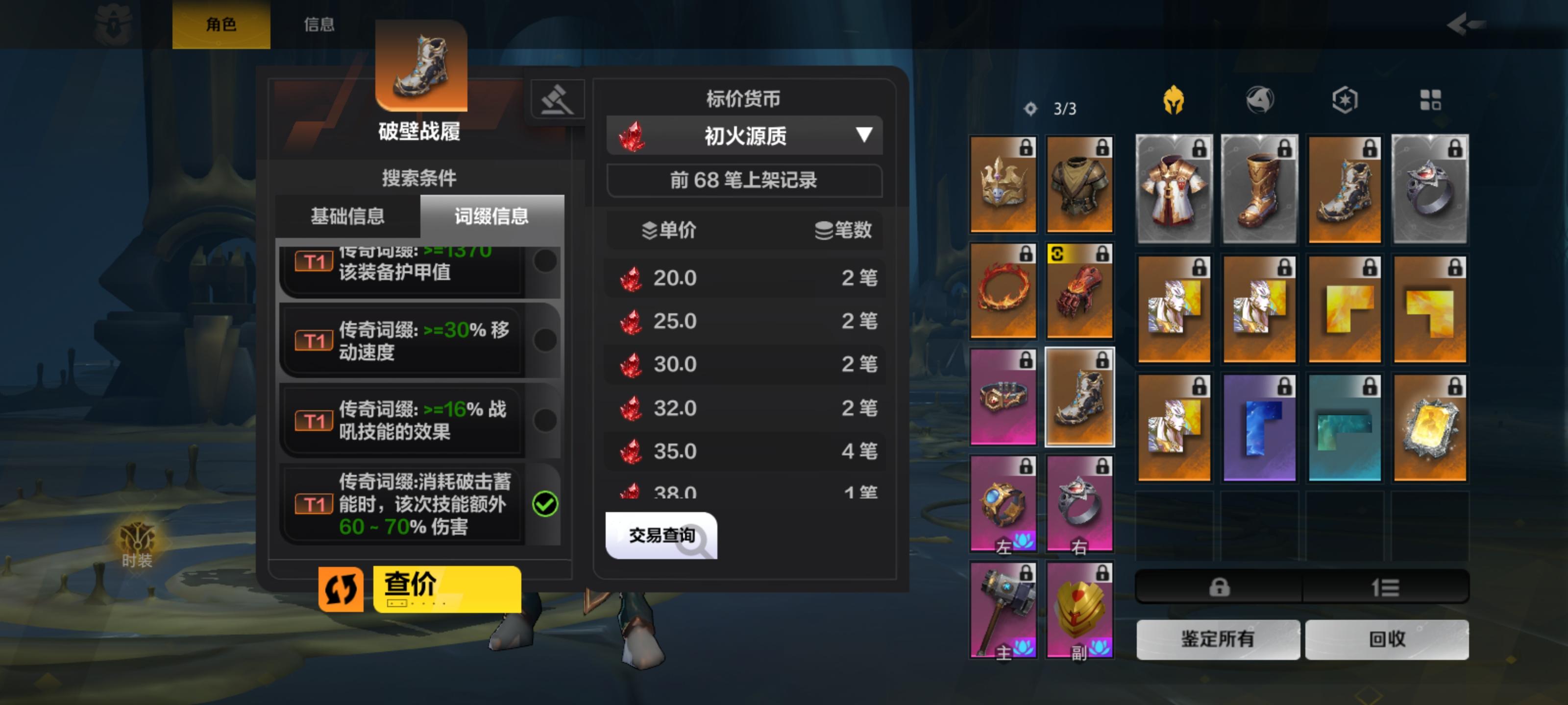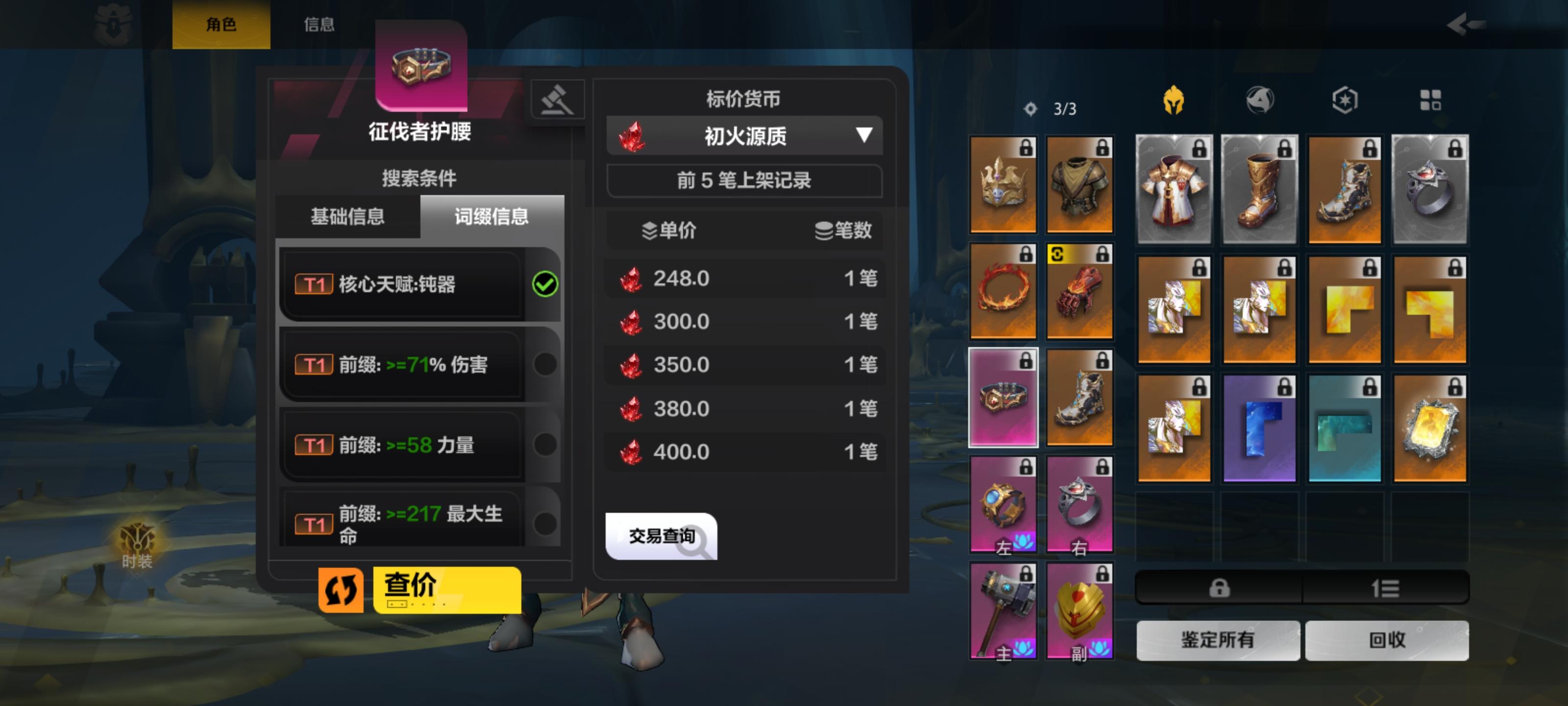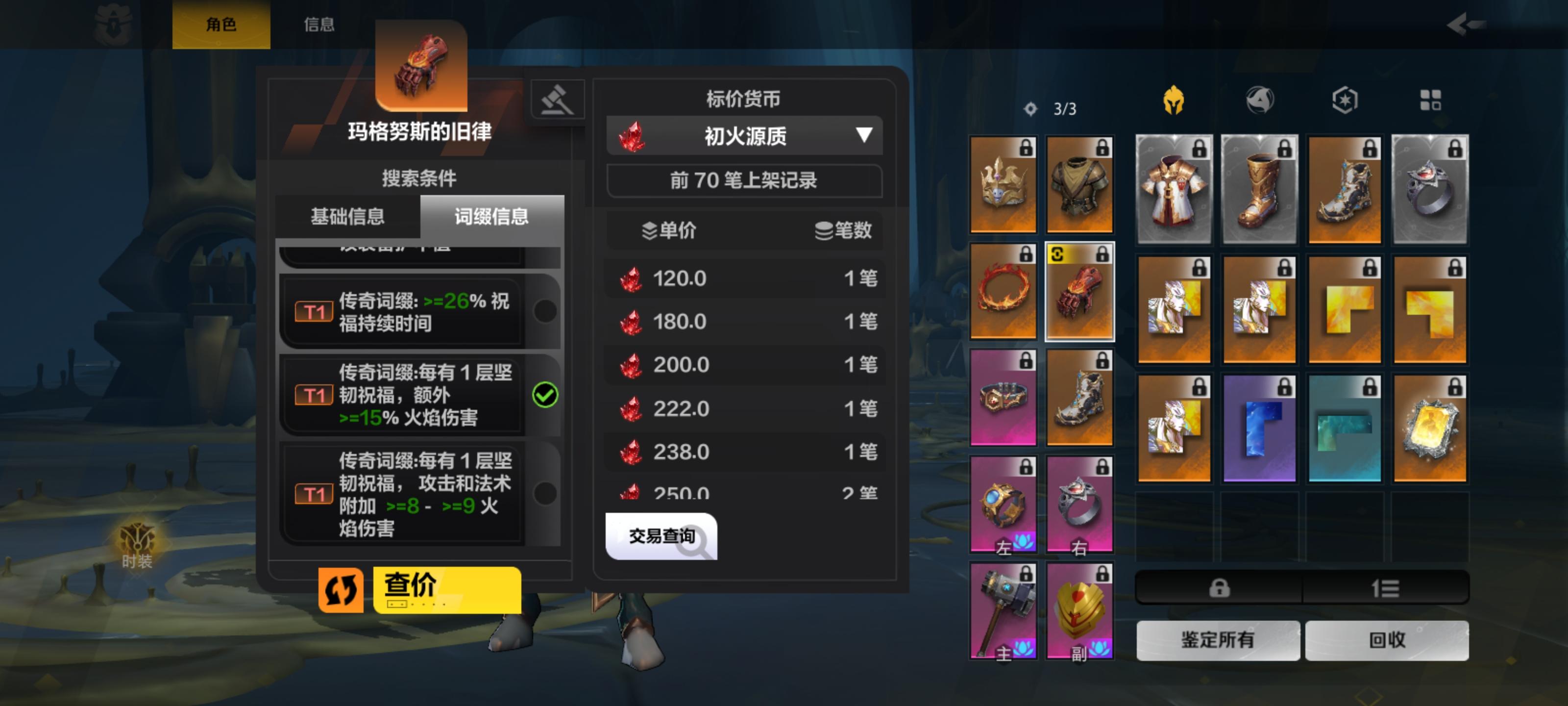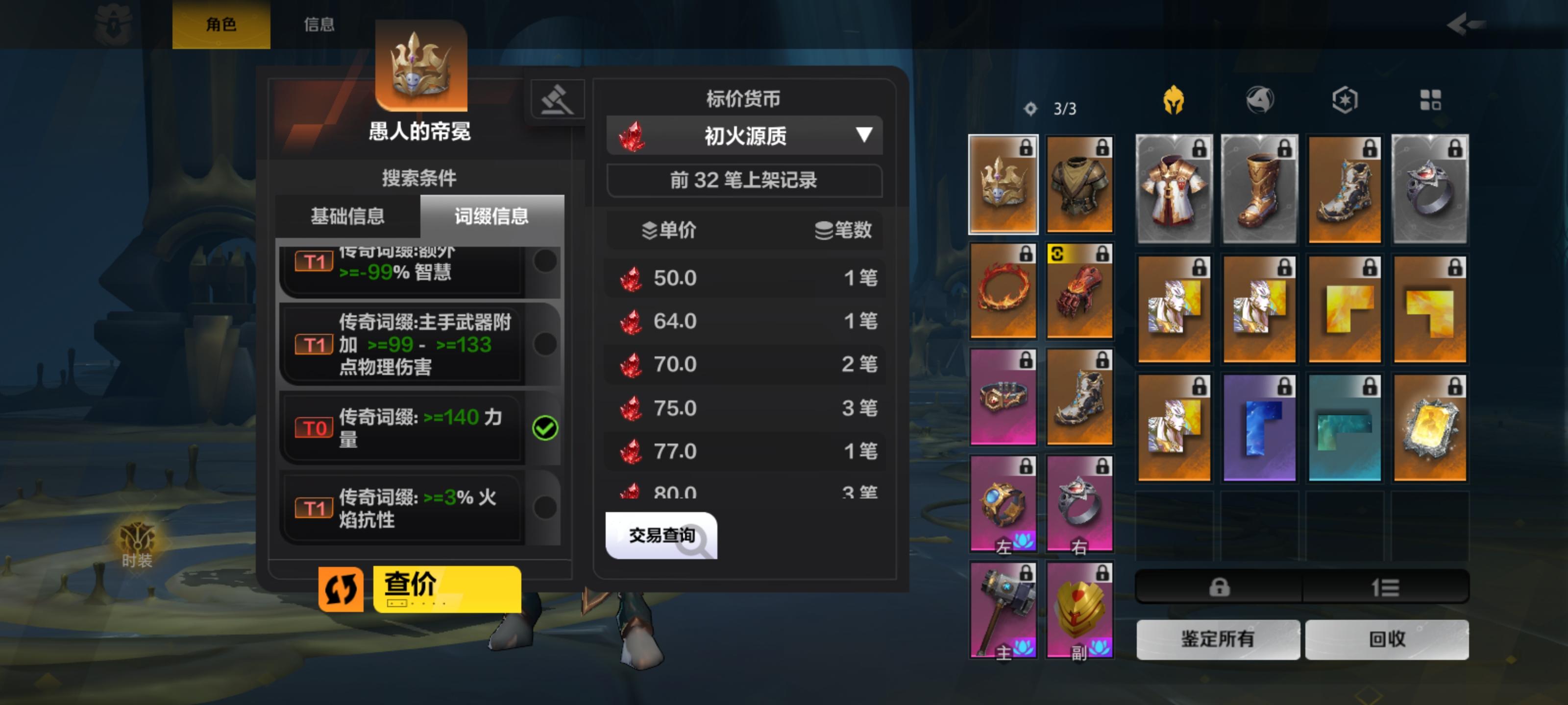 头50火,衣服350火,项链450火,手套120火(如果在板子上你没有找到暴击时标记敌人,那么可以在手套的侵蚀基底中找,大概300火)钝器腰带250火(可以换成加剧腰带,只要120多火,然后人头板找钝器加守势也才300火,巨便宜),鞋子30火,86装备每件算400火,一共2000火逆向传奇中型天赋大于-49%,我是150火买的,现在估计也就200火,棱镜摧枯拉朽或者叱咤风云都可以,