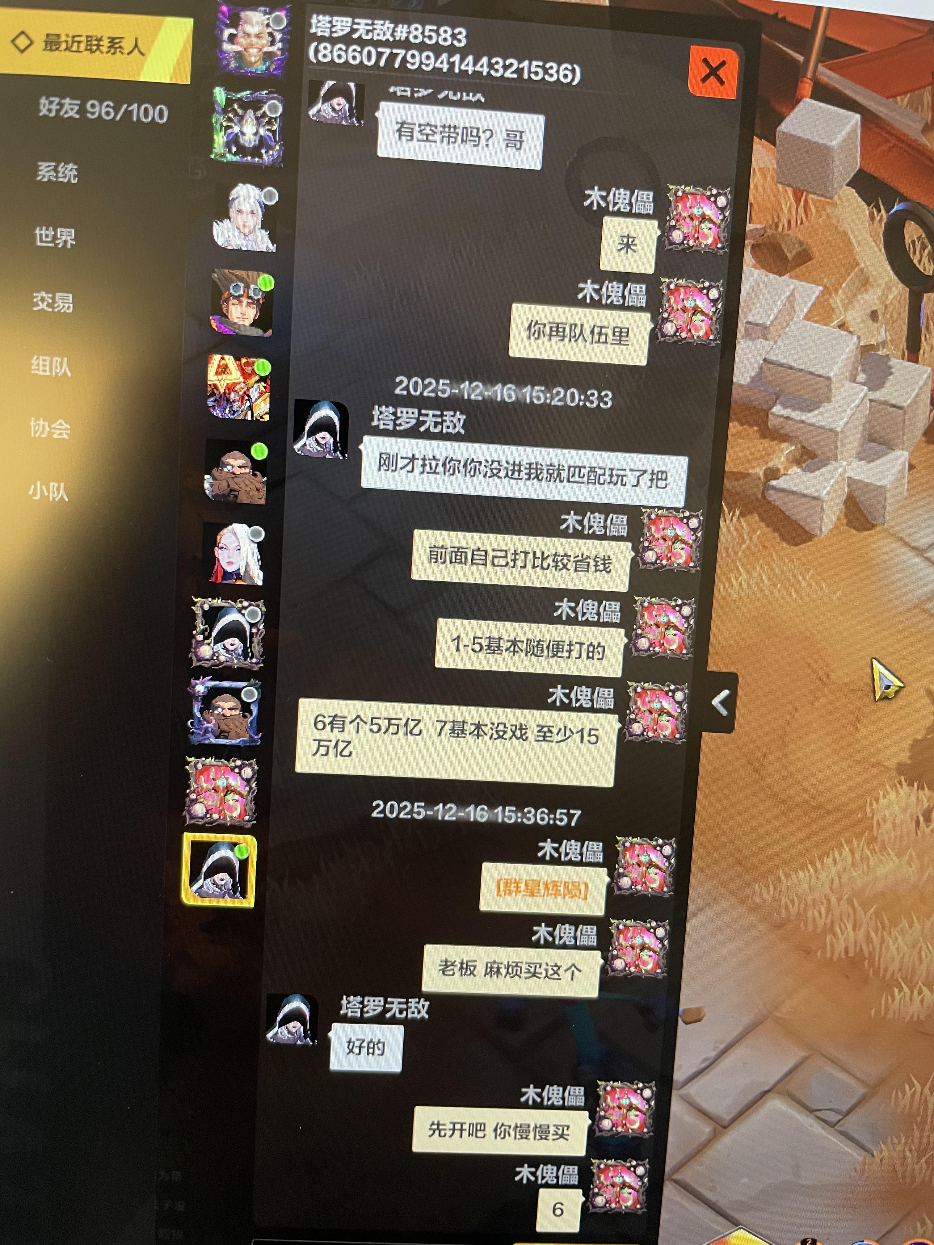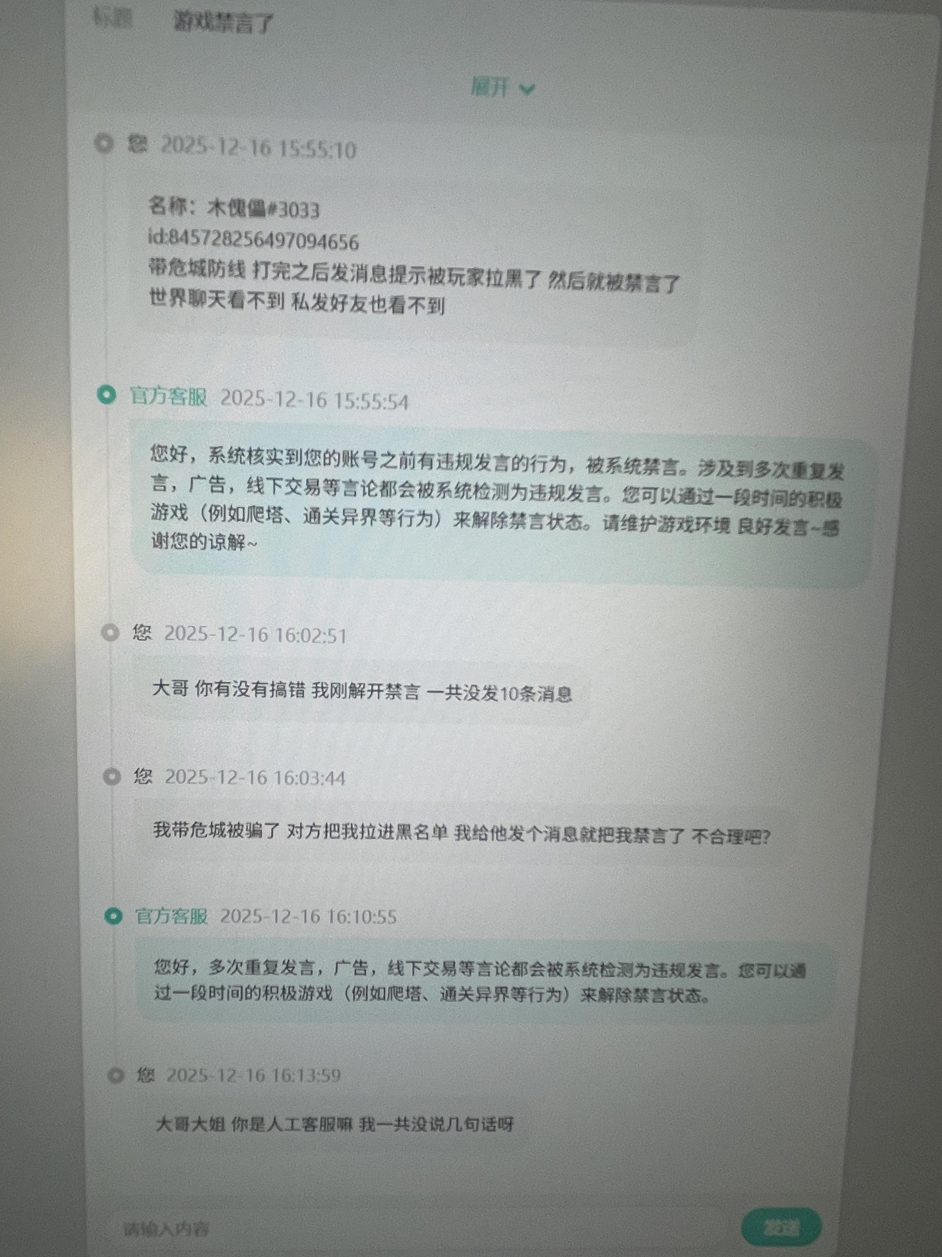 现在禁言力度这么大嘛 我承认我确实发广告带塔了 2-5频道 各发了1次 间隔20分后又发了一次 一共发了8条 早上解除的禁言 下午玩了半小时又禁言了而且每次发的内容都不一样 手打的我发现一个规律 我只要带完被骗了 我给把我拉黑之后的玩家发消息 就会立刻禁言 (发先开吧时候就提示被对方拉黑了) 想到之前的禁言也是被骗了 然后就禁言了 不知道是什么逻辑宠物一般 收益确实远不如带塔 不过带塔