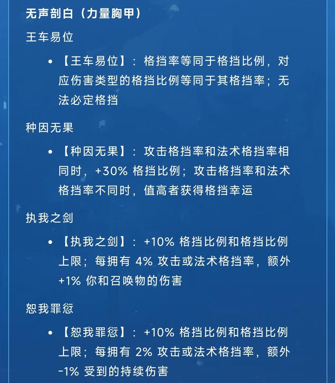 第一条描述不好理解,简单来说就是:格挡比例视为你的格挡率,格挡率视为你的格挡比例,因为格挡比例上限最高80,所以会出现以下这几种情况:1.堆10攻击格挡,10法术格挡时。通过第2.3.4条获得50格挡比例20格挡比例上限,此时你面板为10攻击格挡10法术格挡80格挡比例,由第一条来看实际上拥有了80%概率格挡10%攻击和法术伤害。只要你的格挡率相同,那么你越堆收益越大,双100格挡率时相当于拿8