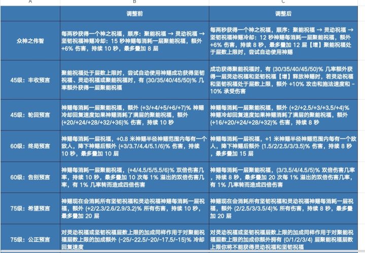 众神之伟智每两秒获得一个神之祝福,顺序:聚能祝福 → 灵动祝福 → 坚韧祝福神赐冷却:15 秒神赐每消耗一层聚能祝福,额外 +6% 伤害,持续 10 秒,最多叠加 8 层调整后:每两秒获得一个神之祝福,顺序:聚能祝福 → 灵动祝福 → 坚韧祝福神赐冷却:12 秒神赐每消耗一层聚能祝福,额外 +6% 伤害,持续 8 秒,最多叠加 12 层聚能祝福处于层数上限时,尝试自动使用神赐--