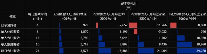 图表说明:1、火价趋势表 是根据多位up主公布的数据拟合的,算是比较真实的,赛季后两个月的火价是按20元/万火的平均价格计算的;2、投资成本方面,6级宠物按3500元计算,第4天进U8的装备按3000元计算,第4天进深空的装备按15000元计算,也是up主们反馈的数据;3、赛季总利润 是扣除了相关投资成本的;4、有宠物 指的是有6级在售的掉落宠物,是老宠物的话每小时收益至少减500;5、