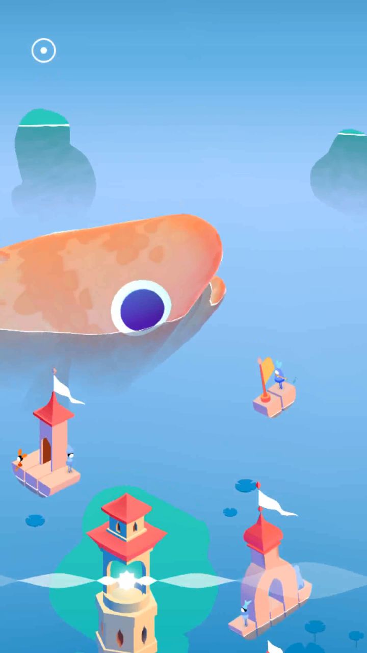 而在后续的关卡中,制作组积累许久的创意想法开始喷涌而出。首先出现的便是我们的老朋友——图腾,准确来说现在应该叫”船腾“,在这里它不再只是单纯的可动结构,而是化身船只,载着我们在一片梦幻的水域中,前往下一片地图,是的,《纪念碑谷3》中的部分章节不再局限于一图一建筑的传统,而是扩大到一个个箱庭地图中。