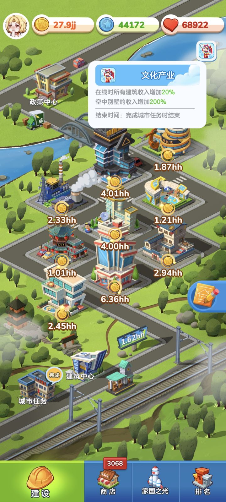 跟实际,不论是阶段政策还是城市任务,前期(主核心300级以前)工业为主,买地为房地产攒钱,前中期(500以前)靠房地产搭配商业起家积累财富,中期(500-800)房地产热潮,后期(800-1500)商业挑大梁,工业起步,大后期(1500-1800)商业式微,工业逐渐重要起来,1800以后商业沦为二线,工业为主。前期钢铁厂结构房企鹅,前中期居民楼菜市场人才公寓中式,中期人才换别墅,商业加一个民食,后期我是图书城+学校+印刷厂,后来大后期转企鹅+零件厂+五金店,图书城单核变为图书城零件厂双核最后零件厂单核,1750-1850明显感觉图书城很乏力,艰难转型为双核,也是贴合实际了