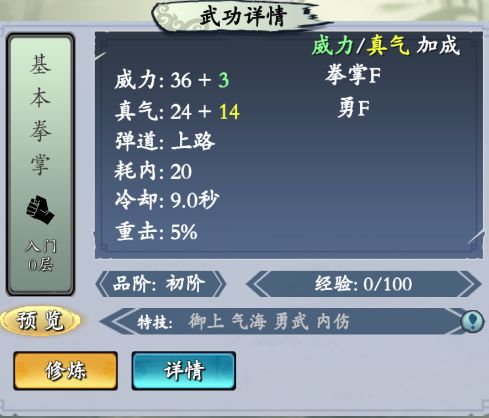 【基本拳掌】 行走江湖最基本的拳掌功夫。 释放栏位: 上路 特效: 中后对面内力回复减半,三路减伤失效 获取方法:出生获得/商城宝箱/秘境产出残页 满级属性加成:9勇3义8拳掌 【长拳】 相传为太祖所创的一套长拳。| 释放栏位: 中路 特效: 击中后几秒伤害必定暴击 获取方法:奇遇获得/商城宝箱/秘境产出残页 满级属性加成:5勇4义3拳掌 【碎金拳】 华山派的高深拳掌功夫, 练至深处可摧金碎玉,故