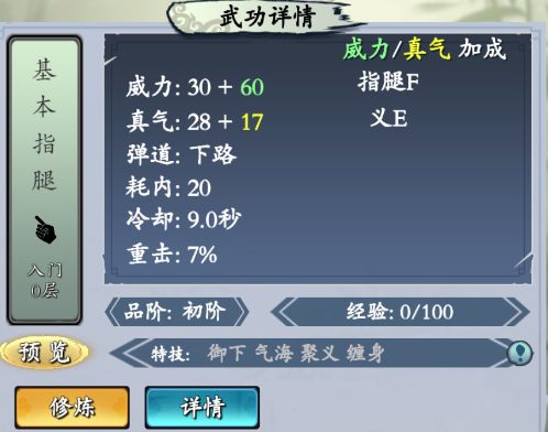 【基本指腿】 行走江湖最基本的指腿功夫。 释放栏位: 下路 特效: 让对面无法闪避 获取方法:天生自带/商城宝箱/秘境产出残页 满级属性加成:7义3智8指腿 【黑山指】 绿林中极为霸道的指法。 释放栏位: 中路 特效: 击中给对面随机一招冷却加倍 获取方法:成就宝箱/商城宝箱/秘境产出残页 满级属性加成:7义3智6指腿 【柔剑指】 玄女派武学,最初用于捕捉麻雀的爪法 释放栏位: 中路 特效: 击中