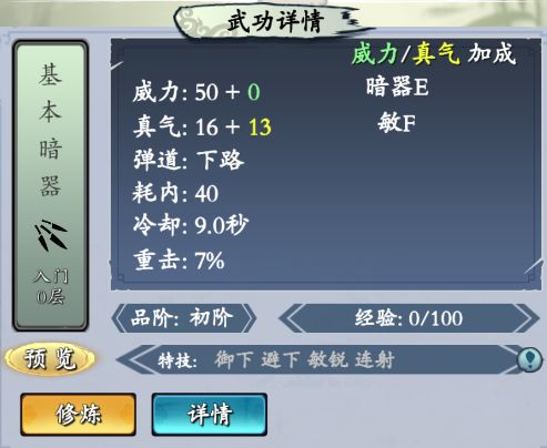 【基本暗器】 行走江湖最基本的暗器手法。 释放栏位: 下路 特效: 连续多次出手,真气威力减少 获取方法:出生自带/商城宝箱/秘境产出残页 满级属性加成:4勇8敏7暗器 【透魂钉】 钉长一寸三分,其身三棱,尖端有刺,多以机簧 发射 释放栏位: 中路 特效: 中毒,可叠加 获取方法:成就宝箱/商城宝箱/秘境产出残页 满级属性加成:4勇6敏9暗器 【玄冰神针】 玄女派的阴毒暗器手法, 发射周身镂刻花纹