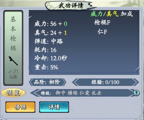 【基本枪棍】 行走江湖最基本的 枪棍使法。 释放栏位: 中路 特效: 其他路随机出一招,但真气减少 获取方法:商城宝箱/秘境产出残页 满级属性加成:8仁3智8枪棍 【太公棍法】 太祖行军打仗时所领悟的枪棍之法,虽是棍法,却尽得 战阵枪法之要。 释放栏位: 下路 特效: 对后续造成穿透伤害 获取方法:成就宝箱获得/商城宝箱/秘境产出残页 满级属性加成:10仁2智6枪棍 【布袋枪法】 丐帮的基础棍法,
