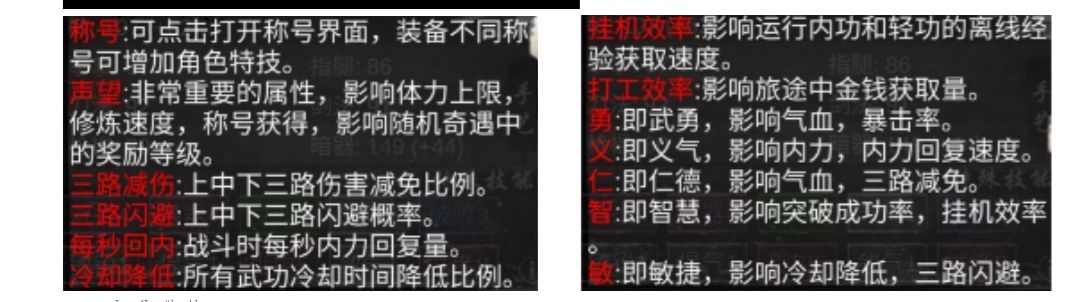 工欲善其事,必先利其器,大家先看下面这张图,了解下各属性大概的作用 然后看这个帖子,了解下弹道拆招 https://www.taptap.com/topic/7105521 还有下面这两张图,了解下技能加成和特效 接下来开始攻略, 1,开局属性如何刷? 先决定好路线,主刷最下面的六边形(即拳掌、剑法……),比如你想主掌法、副剑法,就尽量把掌法剑法初始刷高,中间那个五边形(勇、义……)目前不做评价,