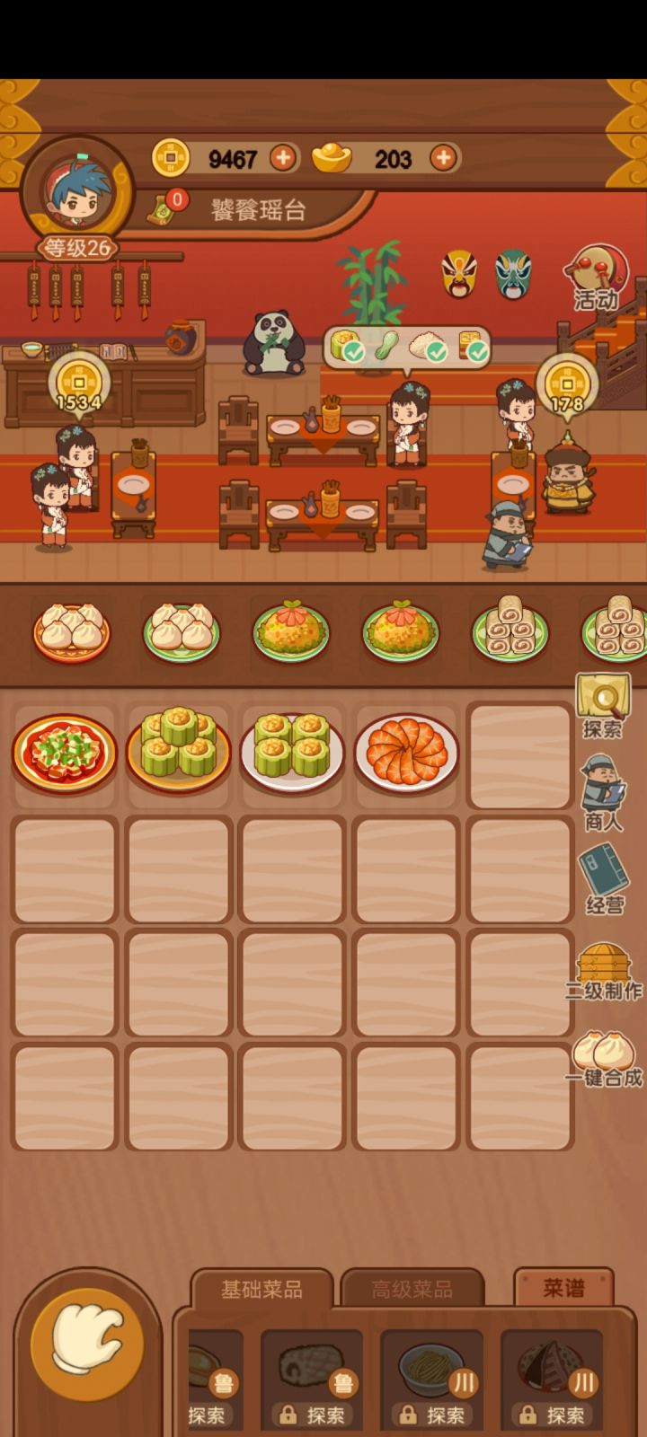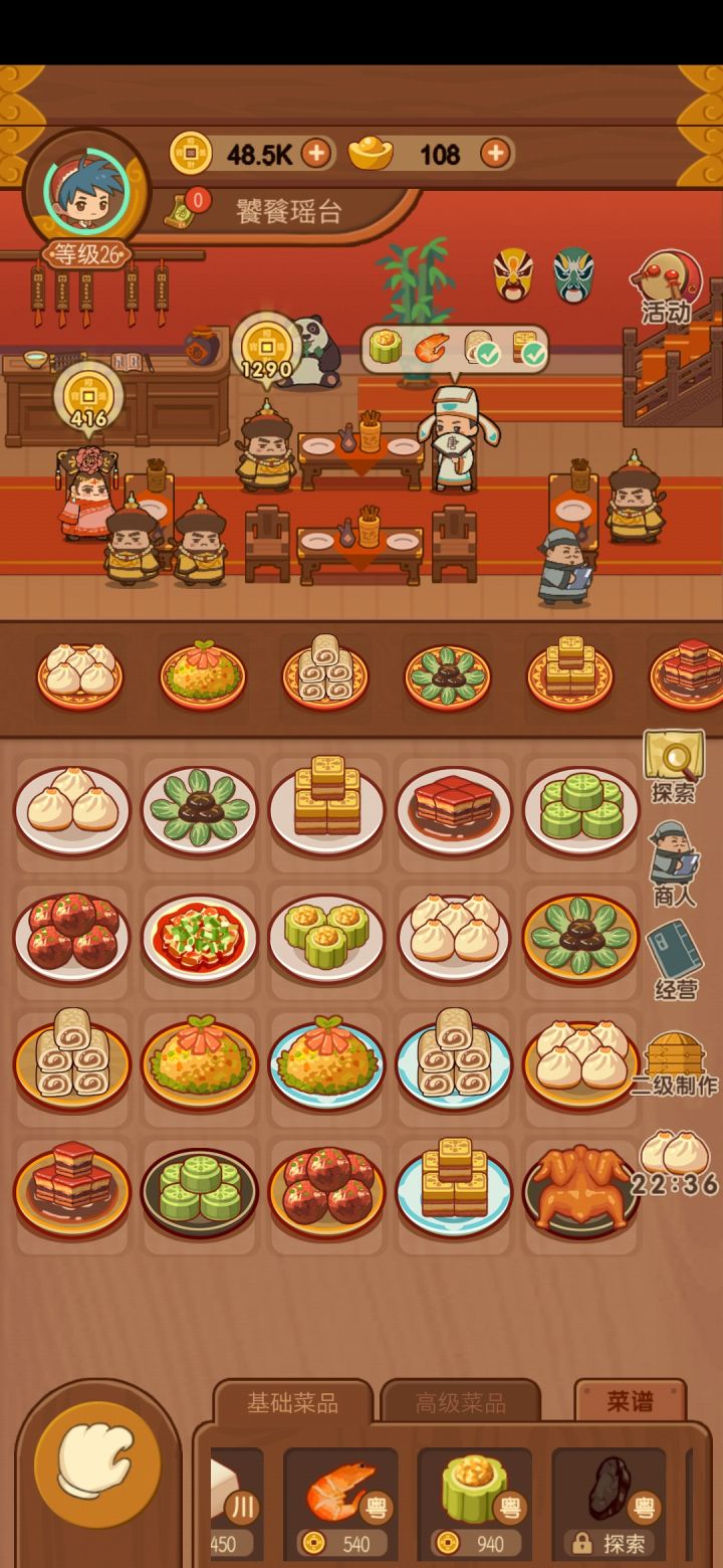玩到26级,后期赚钱还好,基本上五分钟登一次能有几千,是一个合成放置类游戏,食材满级十级,图上第一个包子就是十级2秒一个,不看广告也可以玩,总体来说可玩性有点差,后期探索很慢,基本上比较难解锁食材现在只是测试阶段,所以加油