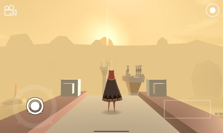 经过明媚的大漠、飞扬的黄沙,感受到偏向埃及+现代元素的壁画和断壁颓垣后你可能会遇到一个或几个同行的伙伴,因为之前的空旷和孤独,你会急于确认他们是不是其他的玩家,你不断地鸣叫,因为这是游戏里唯一的沟通方式——短促的鸣叫和蓄力后的鸣叫,你们确认彼此是真正的玩家,然后相伴前行,这是一种很神奇的感觉,素不相识却长得一模一样,有着一样的目的地,你们可能会通过围巾的长短来分辨彼此、通过鸣叫重新点亮围巾上的光芒,让对方能再飞起,颇有“相濡以沫”的感觉;或者通过鸣叫确认对方的存在和位置,呼唤对方;又或者你只是通过鸣叫来表达自己的心情或者强调自己的存在,随着鸣叫次数的增多,你会发现你鸣叫时发出的符文印记和你伙伴的印记是不同的,你逐渐明白,原来每一个旅人都有独一无二的印记,就像世界上的每一个人都独一无二。