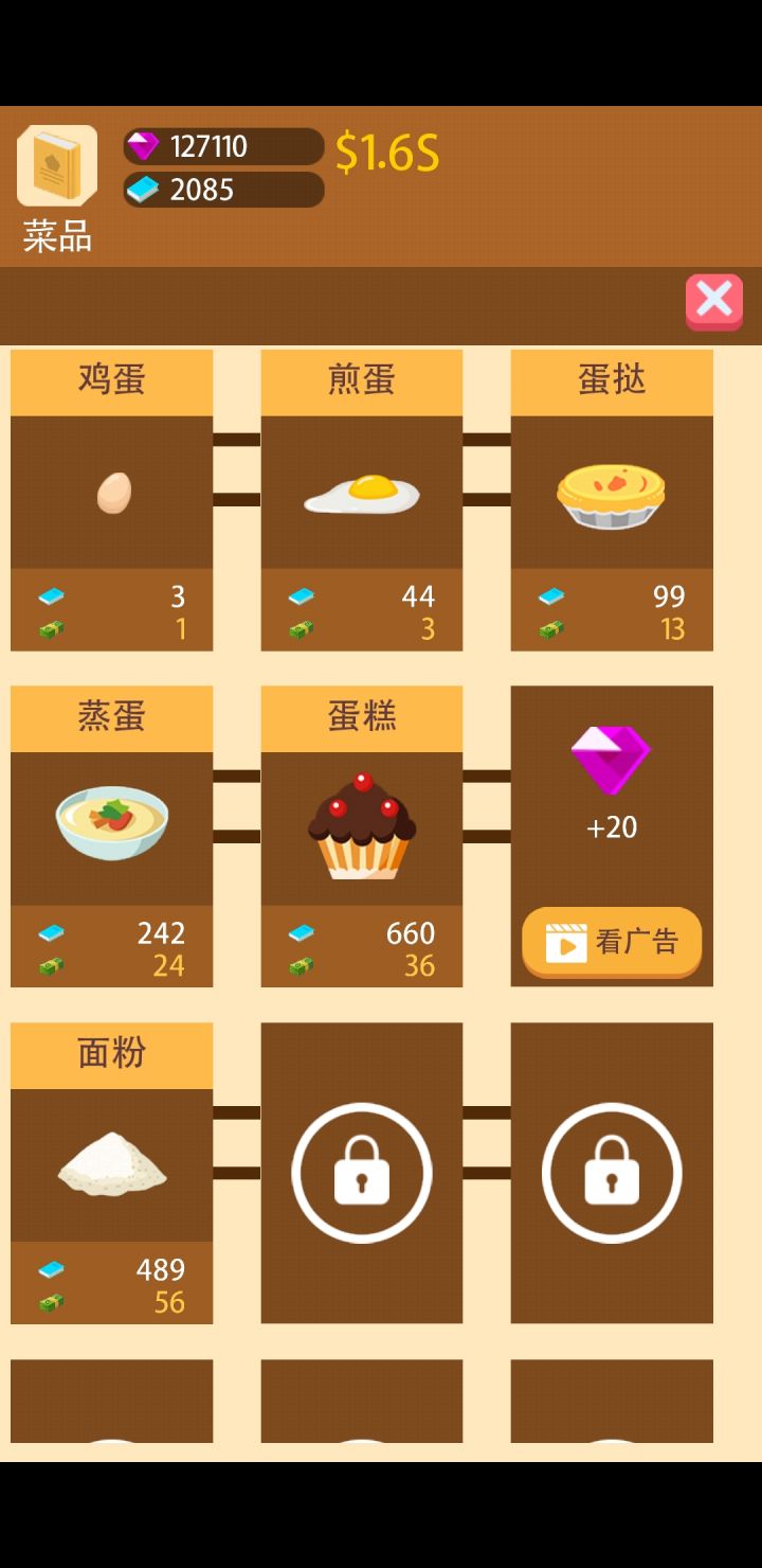 菜谱都没做好就放出来每日登录:说好的每天x100钻石💎呢?千万不要点重组,它只会重置你的等级,收益还是100%升级只需要升级厨房,其他可以(随意)升级。