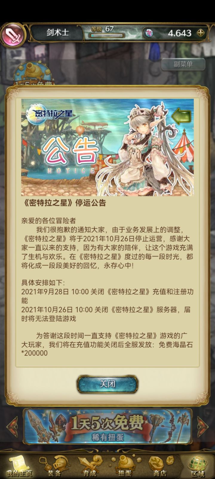 我是个比较抠的人,大多数游戏除了充个月卡基本就不充钱了,这算是少数充了将近1000多的游戏,还记得过年的那段时间,这游戏还挺热闹的和群里的朋友们一起通宵刷一个boss,一直死,一直刷,最后也不知道刷了多少遍了才过的,以至于后来一起组队没人死的时候都感觉不可思议了,后来这游戏慢慢的凉了,群里的人也基本不说话了,我现在也就每天上线假分享一下再领个奖励30石头入手就下线了,今天仔细一看公告就听说要关服了