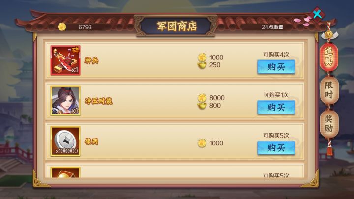 军团商店是军团中一个限时售卖道具的特殊商店,而在军团商店购买道具不需要元宝和银币,而需要的是军团贡献值。军团贡献值之前有过介绍,每天在军团内进行祭天就可获得,参与即可获得。除了每天固定的祭天活动以外,参与军团的副本,为军团副本推进付出贡献,也可以获取贡献值。档积累到一定的贡献和活跃,军团的等级提升上去了,军团商店的各类道具都可以购买。军团商店有三个选项,分别是道具、限时和奖励。道具商店中有神兵