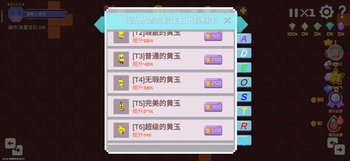 虽然这个天下只打到25关😂新手第一个天赋炼金术,升两级增加初始金币100,加上初值400金币,就有500金币啦。进入游戏后点击右边的⭐️提升运气,选择T6,放置在地图中间,概率不高,一轮只能买一次,且只在购买后第一下放置有效,没出就重新开始,直到出了。出了T6后前面十几关只管做迷宫,金币只要有就升级右边的提升品质,先升到9级,最后一级40波以后再升(9级品质出5级宝石跟10级一样,但出2级
