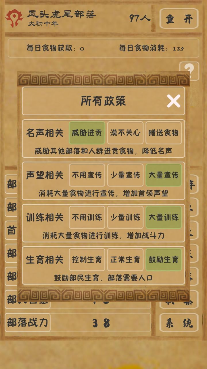 前期(1-5天)分工:采集 先于捕猎 先于搜索(搜索这个游戏很重要,攀搜索科技可以帮你搜到更多的部落,这游戏的核心就是***以后每回合吃一个巨型部落(搜索科技越高,发现高级部落的概率越高),每回合生几万的娃娃)第3-5天攻击最垃圾的部落,如果失败就退出游戏重进。第五年开始之前你的首领声望一定上40了,选老婆(可以选两个),选第一第二个,第六年老婆生儿子,生四个儿子都选探索。我的成就只有以下四