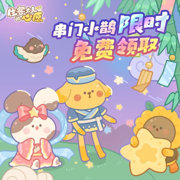《住客大人的心愿》七夕活动即将于七夕当日0点开启!各位老板家的住客关系如何啦?有没有情侣牵手成功呢?小biu先替老板们看下七夕活动有哪些内容。 【七夕活动】1、活动时间:8月22日——8月29日 2、活动内容:(1)七夕小鹊迎门喜,串门小精灵大变样(2)七夕专属头像框上线(3)闪耀家具套装-绵绵牧场限时登场(4)七日签到福利再开,多样专属福利(5)收集星签有好礼,福利多多抽不停#游戏福利