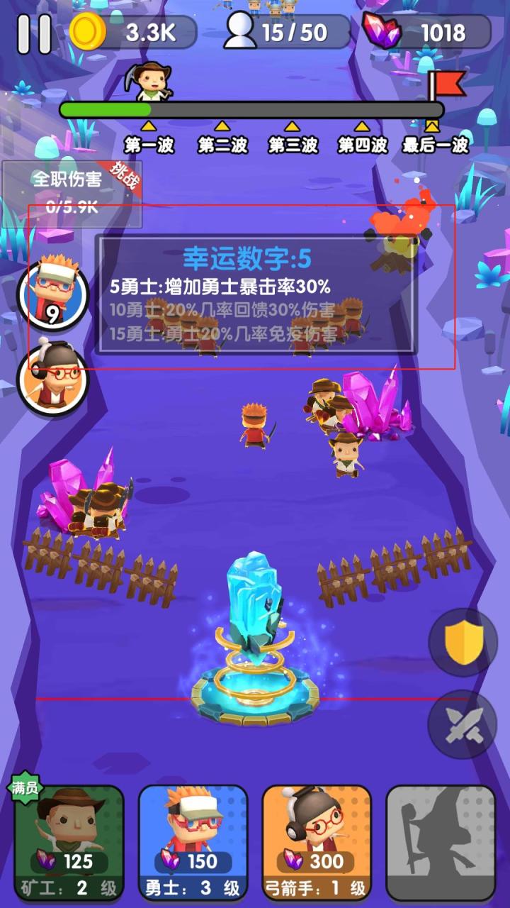 当当当当!玩了一段时间,算是小有心得,下面就给大家带来新手向技巧和部分玩法的分享,希望能给萌新们带来一点帮助。塔防游戏,我们要先了解游戏的兵种。游戏里目前有四种英雄,分别是矿工、勇士、弓箭手和魔法师。矿工:相当于苦力。每局游戏里有两座矿山,采集矿山资源获得矿石,用矿石水晶来购买英雄,上限6人。这货虽然有战力值但并不参与日常战斗,只奋斗在战争背后,当敌军打进基地还会悄咪咪的躲起来。但他是打
