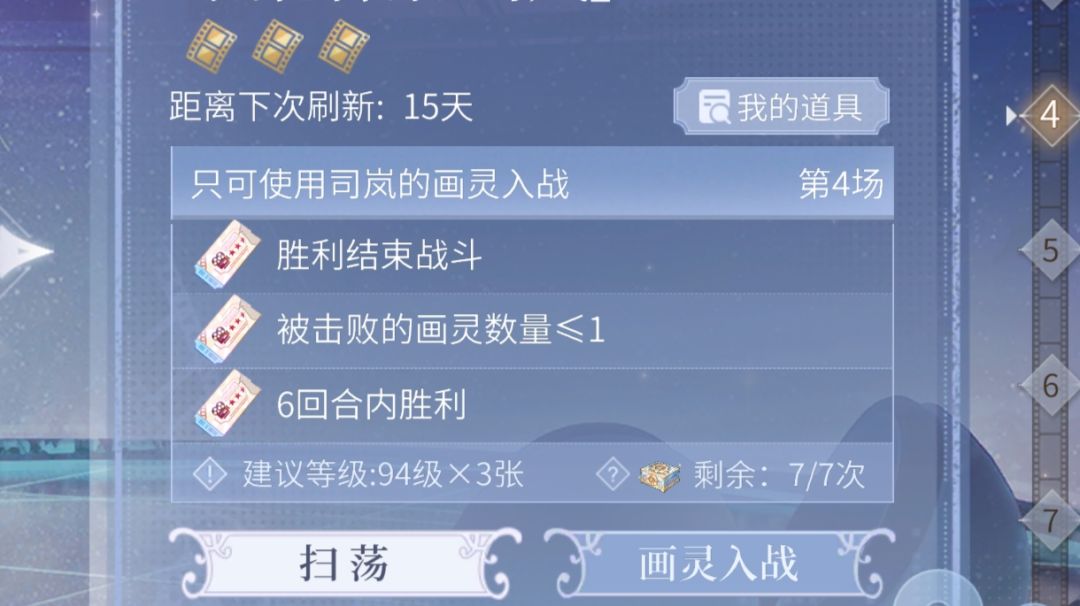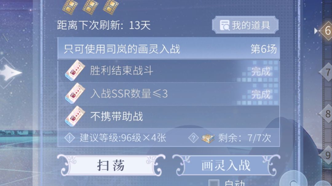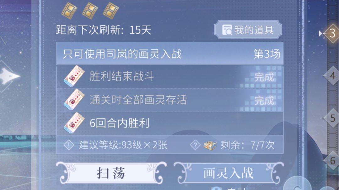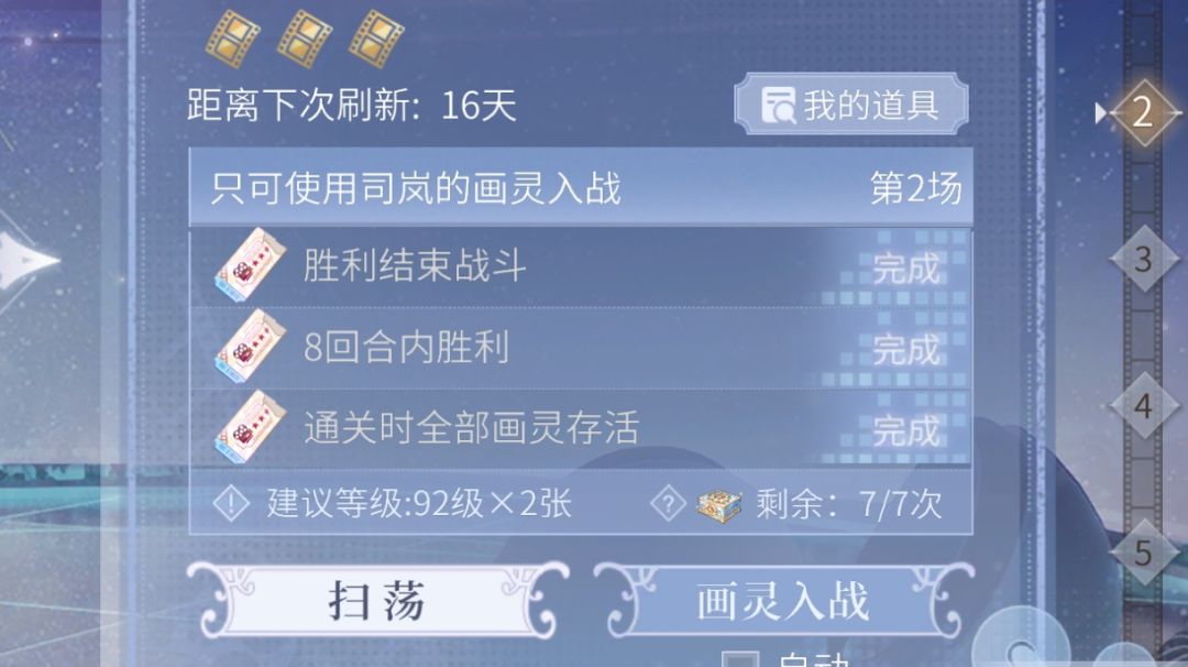 只求通关不求完美~ 该关卡不可借助战。 完美通关条件: 被击败的画灵数量≤1; 6回合内胜利。 关卡内容: ·黑衣卫士首领(中) 不破无敌闪避,特技单体很疼,特技后提高自身效果闪避率2回合,概率闪避冰冻、控条、持续等效果。 ·黑衣卫士(左、右) 不破无敌闪避,没有特技,普攻群伤,不免疫任何debuff。 先打右边,打完打左边,打右边时伤害如有溢出会自动选择打左边。两边血量低,伤害可以硬扛,中间特技