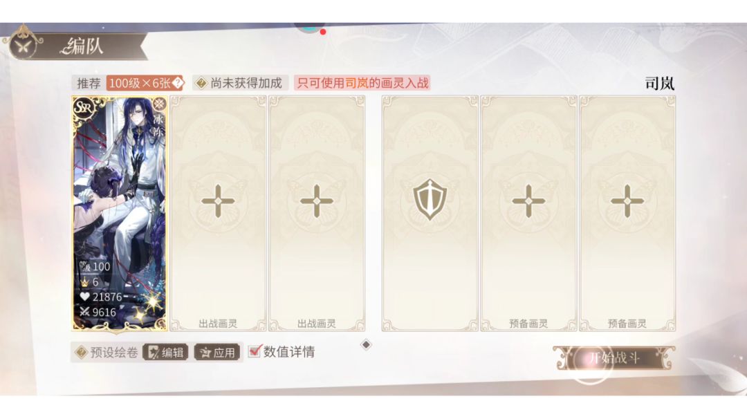 只求通关不求完美~ 该关卡不可借助战。 完美通关条件: 通关时全部画灵存活; 6回合内胜利。 关卡内容: ·公主(中) 不破无敌闪避,特技回血没伤害,不免疫任何debuff。 ·公主护卫(右) 不破无敌闪避,特技群伤比较疼,不免疫任何debuff。 优先打右边,右边血量低伤害高,先打掉后减轻承伤压力。大多情况下难度会比第二层低一些。 推荐练度: 无道具、绘卷情况下: ·功能型卡:1张ssr(100