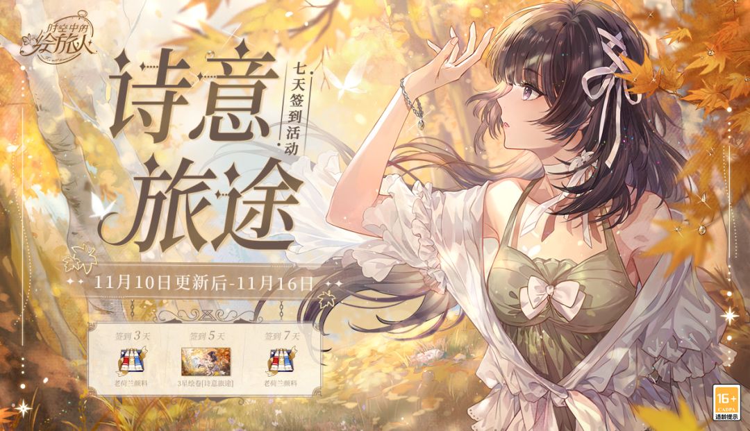 「迎面吹来的,是飒爽的秋风。」 ★11月10日更新后-11月17日05:00,「诗意旅途」七天签到活动开启,累计签到可得[老荷兰颜料]*2、全新三星绘卷[诗意旅途]、[金币]、培养材料等奖励。 ———————————————— 《时空中的绘旅人》复刻活动「暗夜终章」已于11月3日开启! 点击下方即可下载游戏 也欢迎加入官方群806529234参与活动讨论哦~