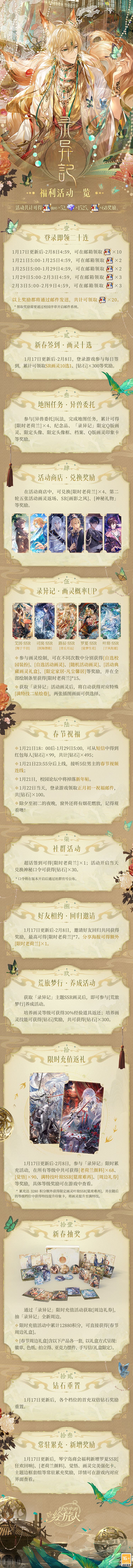★1月17日更新后,新春版本「录异记」活动开启。登录游戏并参与活动可免费得40抽,并可在活动中免费获得活动Q版画灵、限定纪念品、头像及头像框等奖励。 ► 活动期间,累计充值达对应积分,可获得叶瑄SSR[筵席难再]、[老荷兰颜料]、新春周边等奖励,详情可在游戏内查看。 ► 农历新年即将来临,查收专属礼物,与他们共同迈入崭新的兔年吧~ ★消耗[周边礼券],即可抽取「录异记」全新周边;限时充值活动累计1