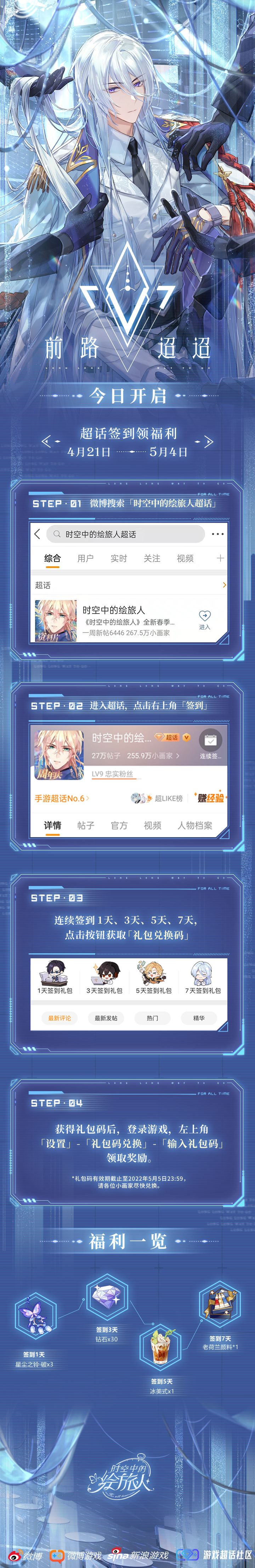 ★全新活动「前路迢迢」现已开启,将持续到5月4日!《时空中的绘旅人》微博超话7天签到活动同步上线。 ► 登录游戏参与活动,可获得SR画灵[黑暗尽头]、二星绘卷、限定头像框等丰厚奖励。 ► 超话7天签到(4月21日-5月4日) 前往《时空中的绘旅人》微博超话社区连续签到7天,即可获得[老荷兰颜料]、[钻石]、[冰美式]等丰厚奖励。 ★特别说明: 1. 超话签到礼包有效期至2022年5月5日23:59