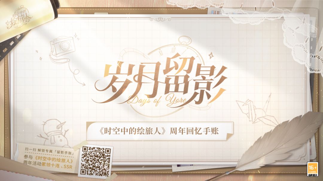 回忆角落清风拂起,光阴往事历历在目。 行遍诸多世界,始终铭记序时。 ★参与方式: ◆ 小画家们可通过手机扫描海报二维码或进入「序时纪行」周年时光机页面。 ◆ 输入游戏学号,通过游戏内邮箱接收验证码(验证码30分钟内只能发送一次,30分钟内可多次使用),绑定账号。 ◆ 拨动指针,查收周年时光记录。 ◆ 翻阅至最后页面,长按可保存你专属的时光记录页;点击[领取礼包],可获取游戏礼包兑换码。 ※特别说明