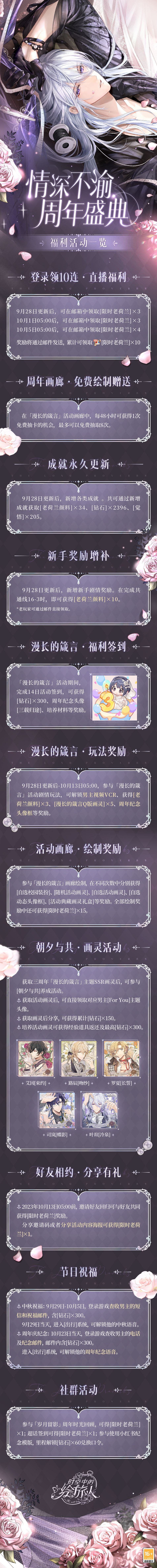 ★9月28日更新后,周年庆版本活动「漫长的箴言」开启。登录活动累领20抽,参与活动签到与玩法可得丰富[钻石]、[老荷兰颜料]、全新Q版画灵、周年限定头像及头像框等奖励,详情可点击下方长图查看。 ► 活动期间,累计充值达对应积分,可得艾因SSR[代罪亦同谋]、[限定家居·繁花箴言]、[庆典礼券]等奖励。 ► 获取「漫长的箴言」画灵后,可领取[For you]主题头像;参与[朝夕与共]养成活动,可获得