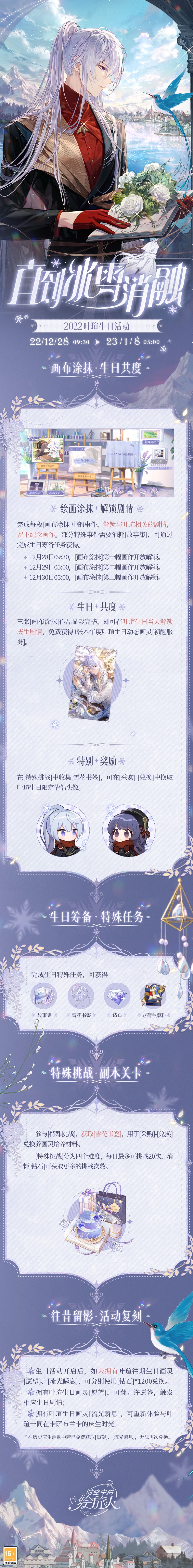 ★活动时间:12月28日09:30-2023年1月8日05:00 ★活动主要分为[画布涂抹]、[生日筹备]、[特殊挑战]三个部分。 ► 每日完成[画布涂抹]事件,解锁全部剧情,即可在12月31日生日当天开启剧情,免费获得本年度叶瑄生日动态画灵[初醒服务]。 ► 完成[生日筹备]任务,可得[故事集]、[雪花书签]、[钻石]及[老荷兰颜料]等奖励。 ► 参与[特殊挑战],获取[雪花书签],兑换叶瑄生日