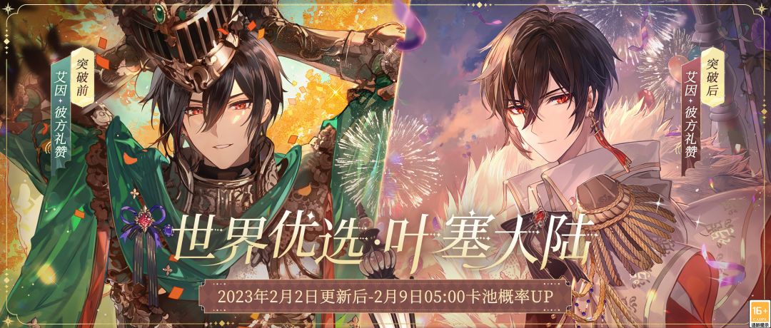“你是属于这片大陆的神女,也是……我一个人的皇后。” ★2月2日更新后,艾因SSR[彼方赞礼]限时返场,在[世界优选·叶塞大陆]卡池中获得概率提升。卡池具备绘制奖励,绘制次数达160次时可获得[叶塞礼盒·艾因]。 ► 卡池开放时间:2月2日更新后 - 2月9日05:00 ► 卡池说明:艾因SSR[彼方赞礼]在[画廊]中概率UP,获取概率提升至占全部SSR画灵的50%,前3张SSR必得1张。 ※ 特