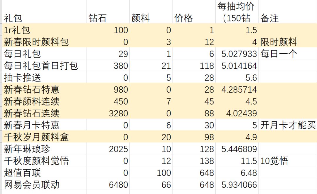 拉了个excel,5r以下标黄。 不知道这次累充是啥卡,蹲蹲看再说要不要冲。 现在攒了好多抽嘿嘿都足够两张自选了,可能礼貌氪一点点,累充卡太美貌另说!
